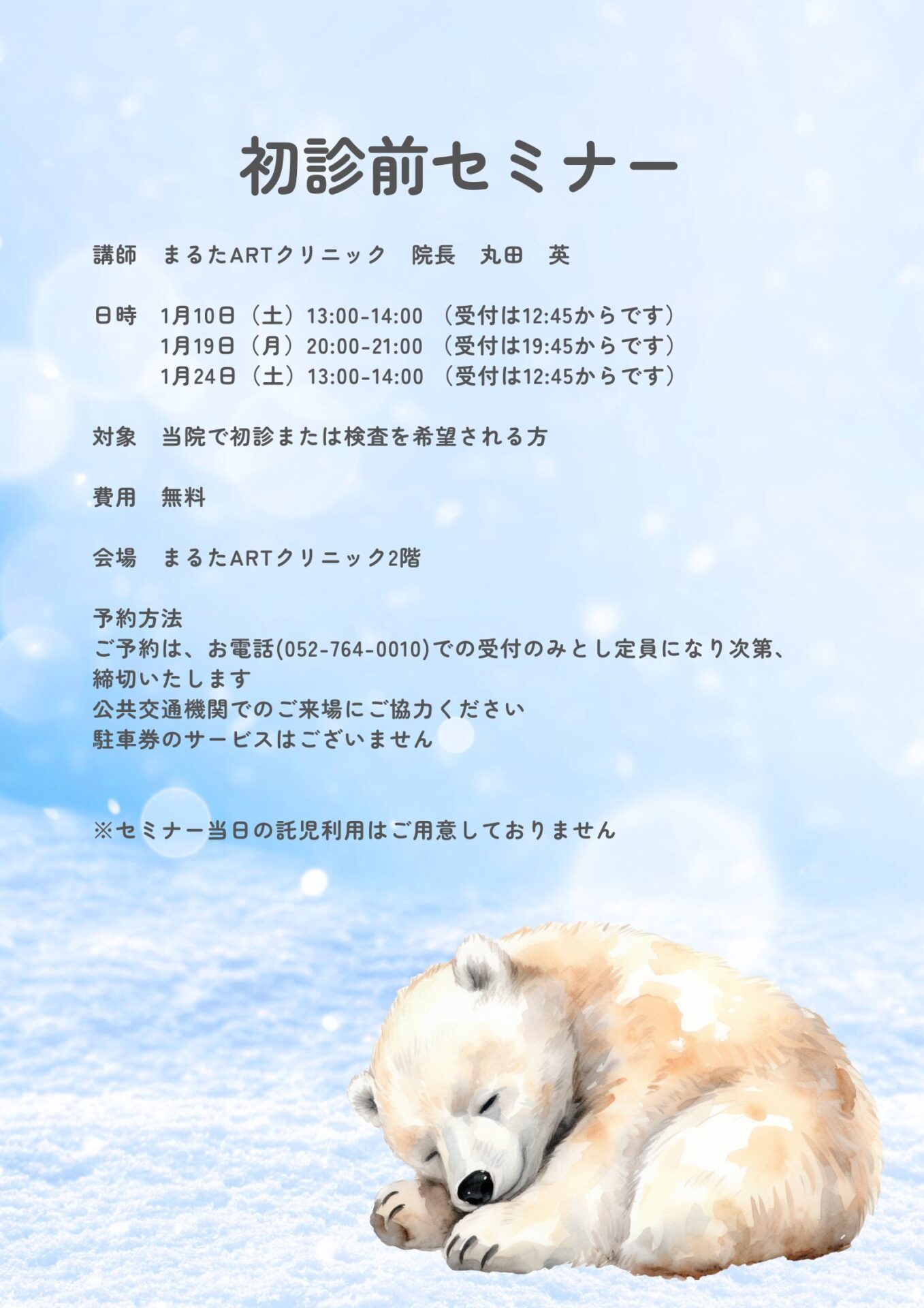 2026年1月より、初診を検討しているカップルを対象に「初診前セミナー」を開催いたします。当院の方針である無駄のない最短の治療を目指すために、どのように考え、どのような検査を行えばよいかを説明いたします。特に初めて不妊治療を検討する方にセミナーを受講いただき、当院の方針がご夫婦に合致されるか、また必要な検査を省略するリスクなどを知っていただきたいと考えています。みなさまのご参加をお待ちしております。